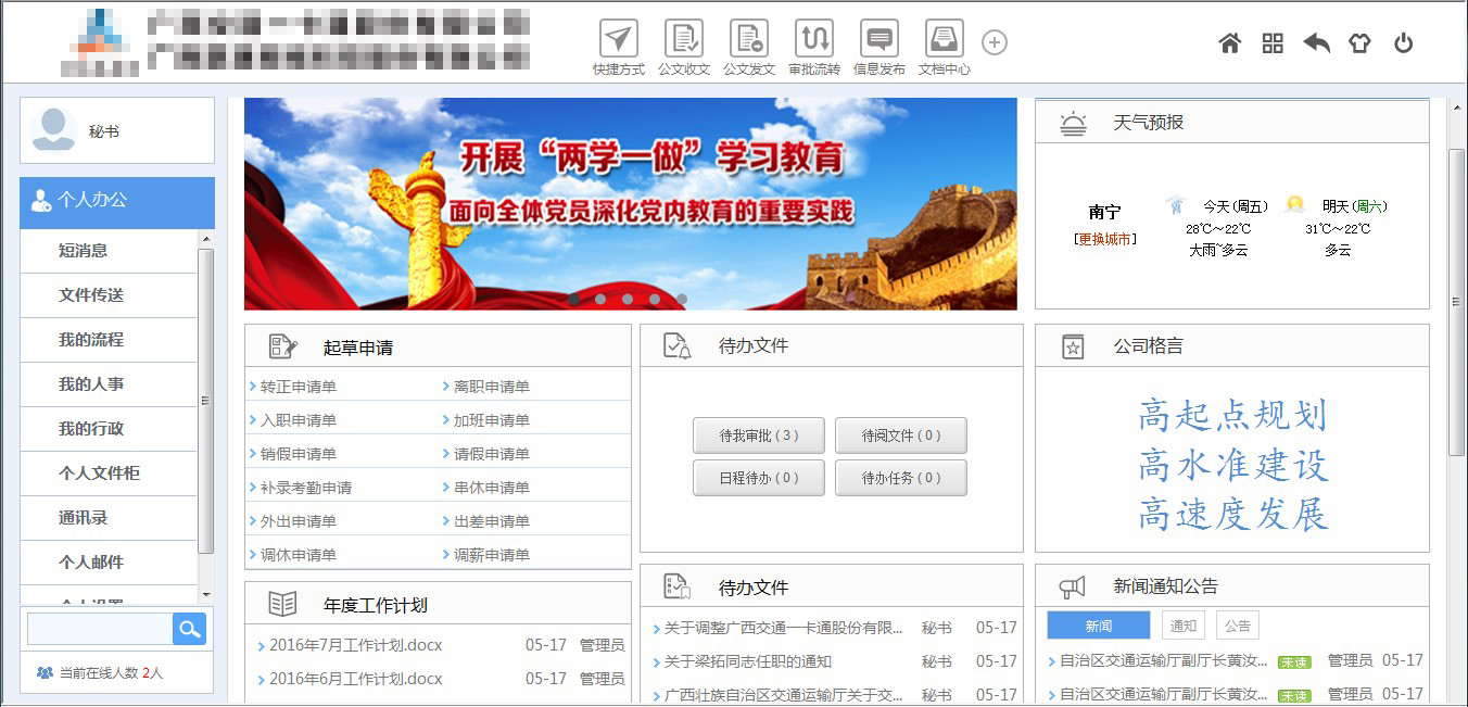 跨入互聯(lián)網(wǎng)+電子化辦公時(shí)代,將大幅提高信息流轉(zhuǎn)上傳下達(dá)效率,根據(jù)各單位各職能范圍,設(shè)置不同的信息發(fā)布及展示門(mén)戶,將單位的新聞、通知、公告、公司大事記、領(lǐng)導(dǎo)指示、規(guī)章制度、生成規(guī)范等信息能快速、實(shí)時(shí)的發(fā)布到指定的相關(guān)部門(mén)或人員的電子政務(wù)辦公桌面,并能實(shí)時(shí)了解到所發(fā)布信息相關(guān)人員是否及時(shí)閱讀了解,讓黨政文宣工作更加全面、高效;