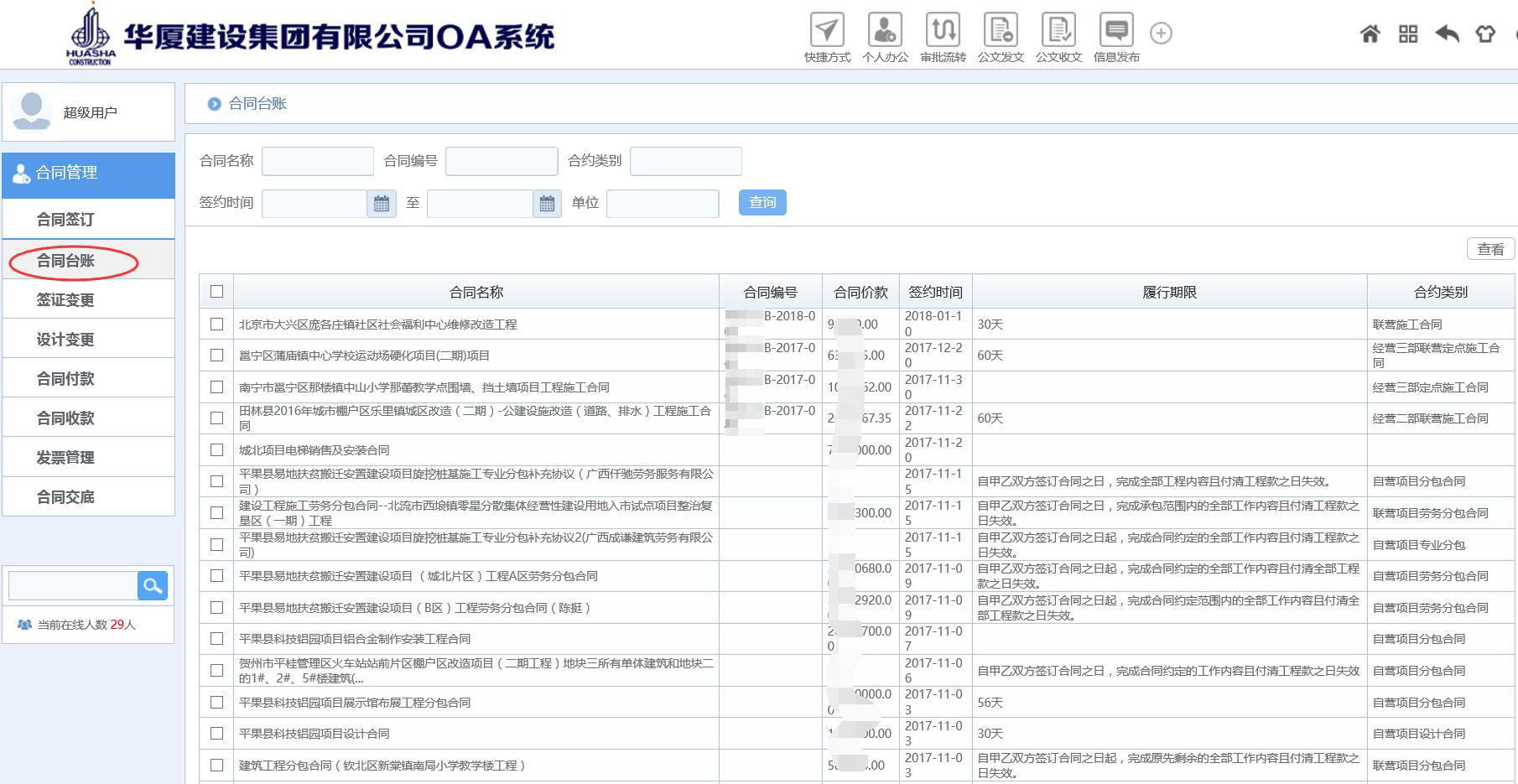 匯高可以結(jié)合建筑公司的合同管理需求自定義搭建適合企業(yè)應(yīng)用的合同管理應(yīng)用模塊,涵蓋與甲方的項(xiàng)目承包合同、勞務(wù)分包合同、材料采購合同、設(shè)備租賃合同的在線審批流轉(zhuǎn),合同臺(tái)賬自動(dòng)生成方便查詢;合同付款申請(qǐng)-審批(審批過程中可以與相應(yīng)合同進(jìn)行關(guān)聯(lián),自動(dòng)帶出合同數(shù)據(jù)、歷史付款記錄及付款數(shù)據(jù),如累計(jì)已支付金額、累計(jì)已支付比例、還有多少?zèng)]付等),合同變更管理,財(cái)務(wù)票據(jù)管理等,能夠?qū)崿F(xiàn)按照公司架構(gòu)體系、崗位權(quán)責(zé)體系進(jìn)行智能化自動(dòng)流轉(zhuǎn)及相應(yīng)權(quán)限控制,支持自定義查詢,自動(dòng)生成指定格式的合同執(zhí)行統(tǒng)計(jì)分析報(bào)表方便領(lǐng)導(dǎo)查看,實(shí)現(xiàn)合同的統(tǒng)一管理,可控、可知。
