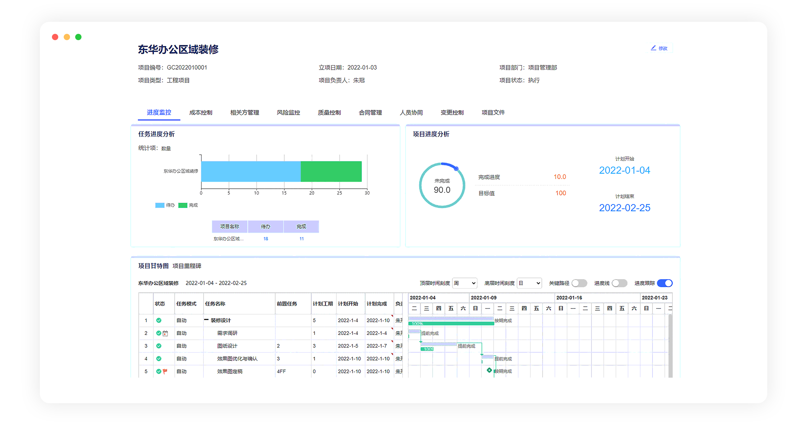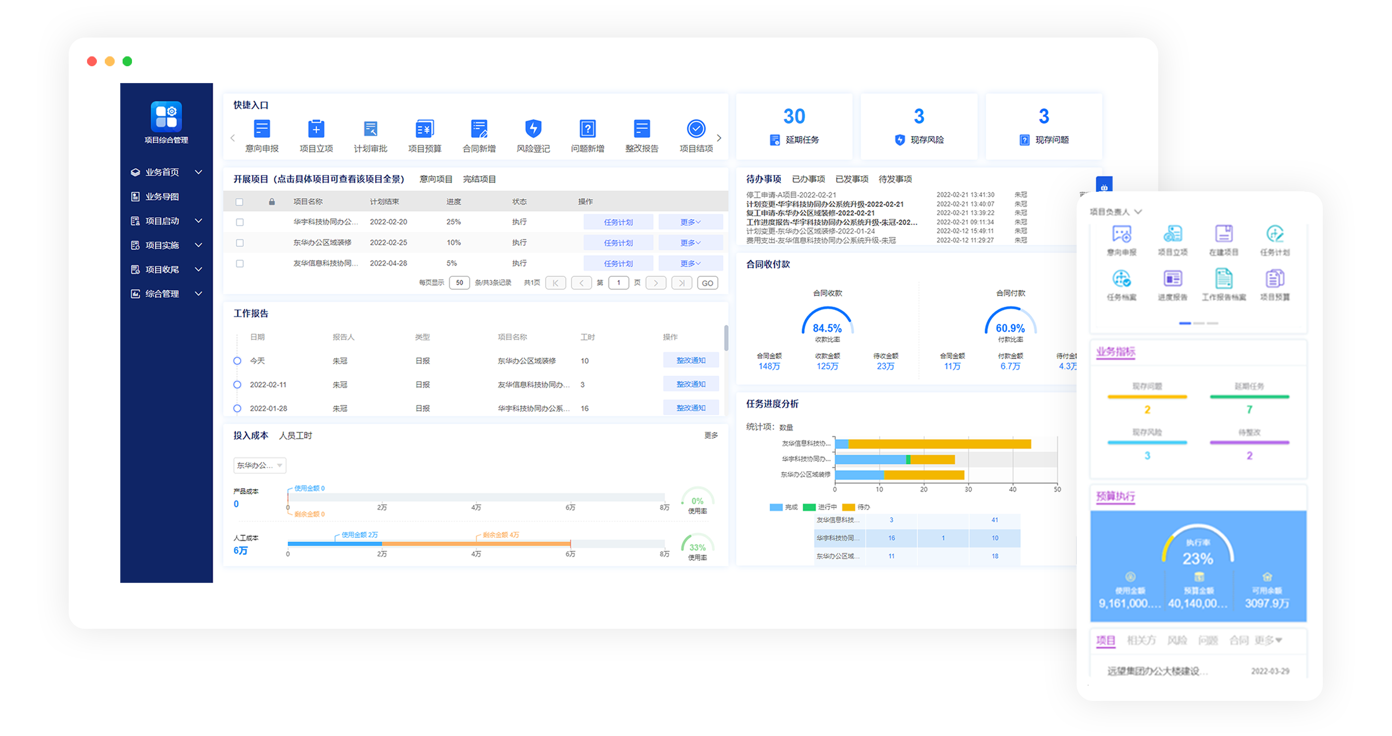 查看任務(wù)進度、工作報告、人資投入、合同收付款以及延期任務(wù)、現(xiàn)存風險、問題等,快速創(chuàng)建任務(wù)計劃,發(fā)起、處理相關(guān)事務(wù)。