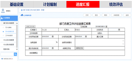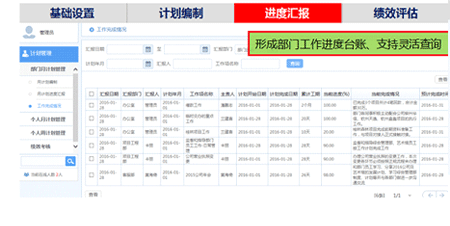 進(jìn)度管理系統(tǒng)以制定工作目標(biāo)、計(jì)劃執(zhí)行匯報(bào)、績效評估為主線,實(shí)現(xiàn)對部門工作計(jì)劃以及個(gè)人工作計(jì)劃的全面管理