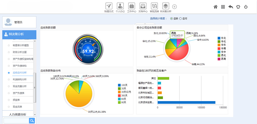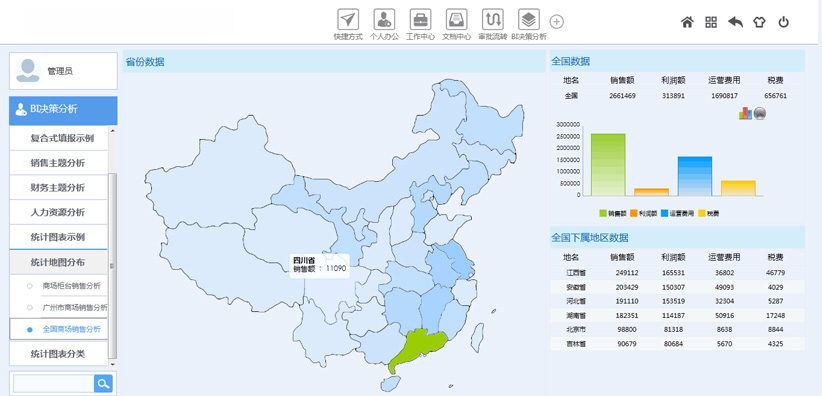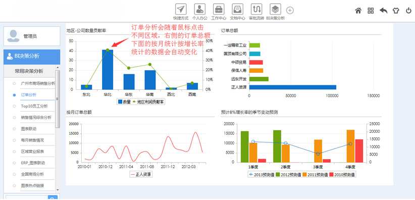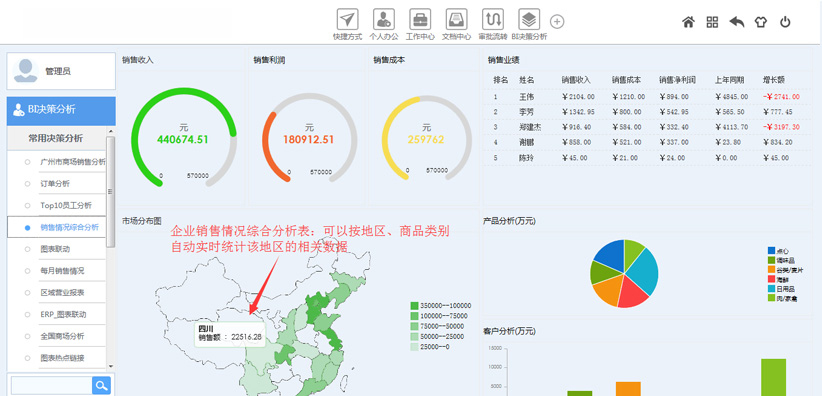 支持與BI智能系統(tǒng)進行大數(shù)據(jù)集成,將BI系統(tǒng)中各項分析數(shù)據(jù)推送到OA系統(tǒng)框架界面上,領(lǐng)導(dǎo)可以通過登錄OA即可快速查看企業(yè)經(jīng)營的各項數(shù)據(jù)情況。