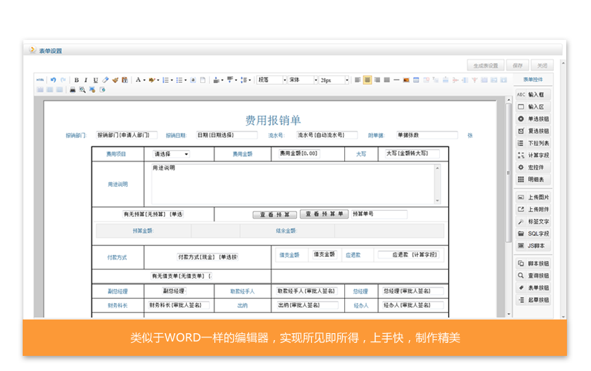 國內(nèi)最容易維護(hù)的OA軟件平臺,系統(tǒng)已內(nèi)嵌了圖形化工作流設(shè)計引擎、電子表單設(shè)計器,內(nèi)置有豐富的功能控件,